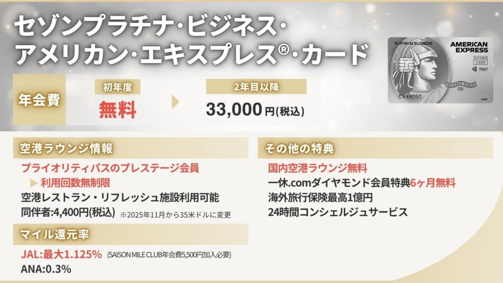 羽田空港のプライオリティパス対象ラウンジを最大限活用したい人には、初年度年会費無料で発行できるセゾンプラチナビジネスアメックスカードが断然おすすめです。