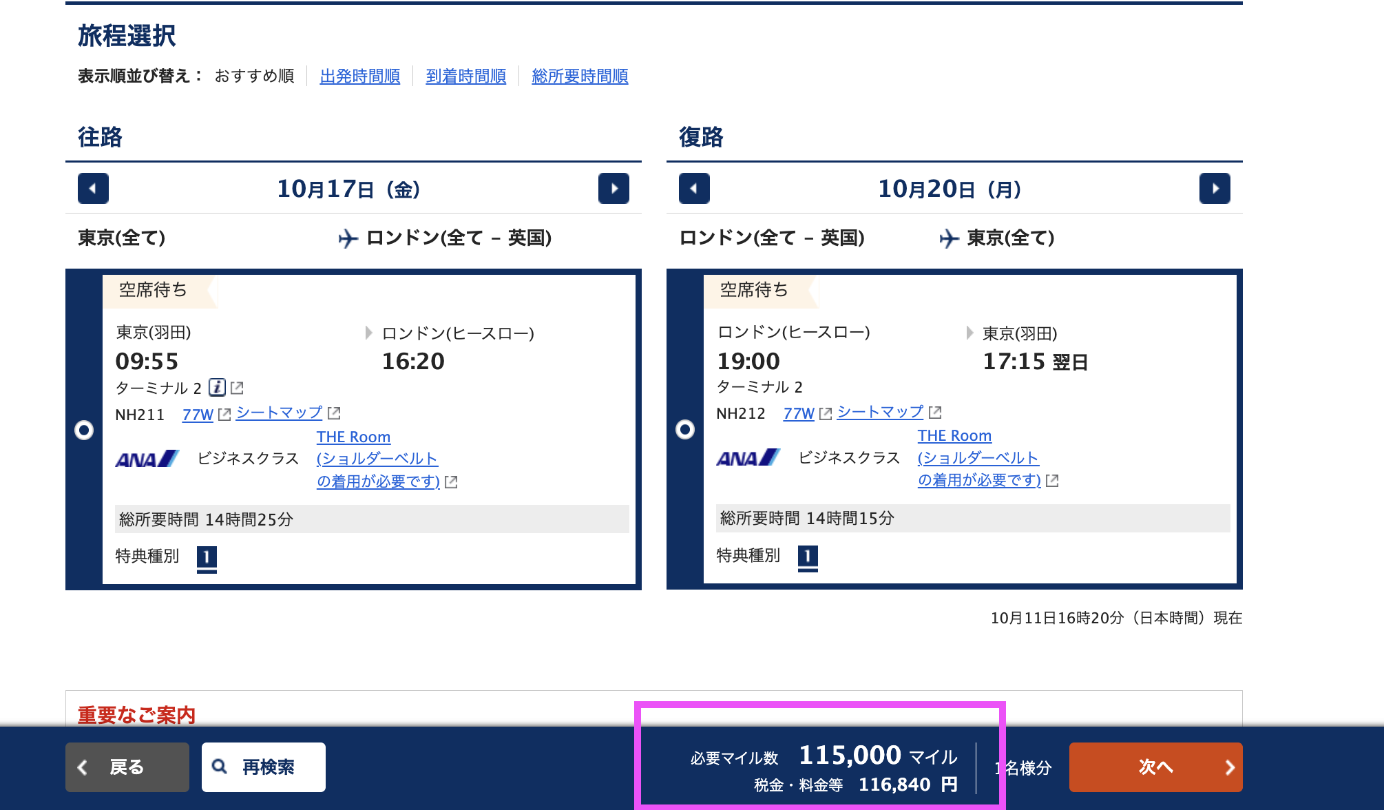 必要マイル数:85,000マイル(片道)