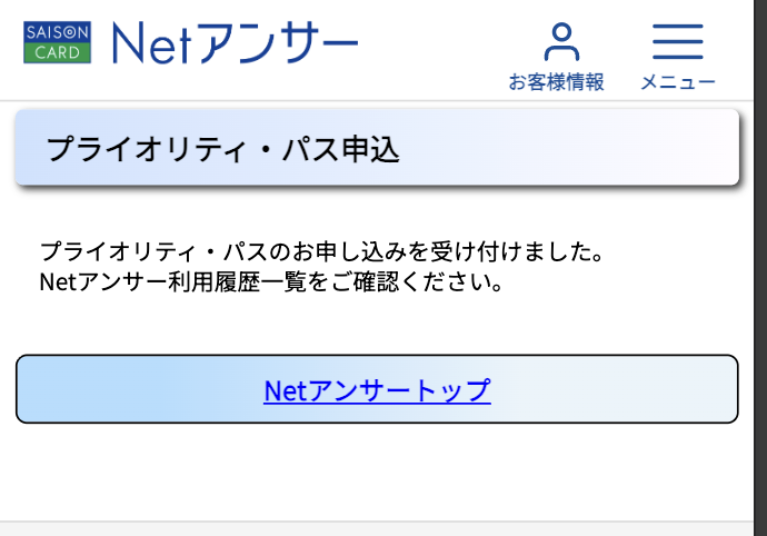 セゾンPortalアプリorNetアンサーの登録が完了したら、プライオリティパスの申し込みを行いましょう。