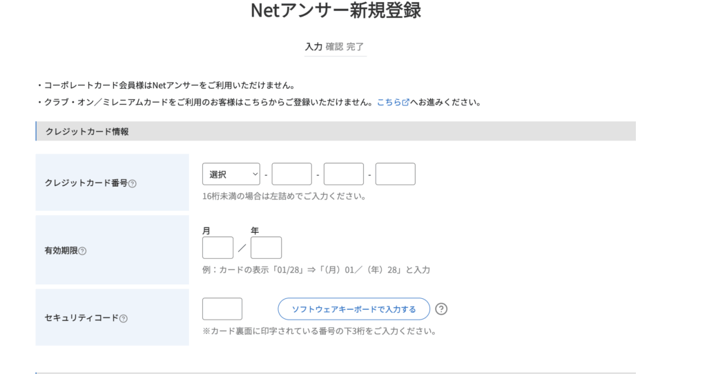 すると、届いたセゾンプラチナビジネスアメックスカードのカード番号やセキュリティコードなどを入力します。