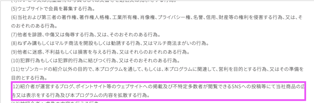 これはセゾンプラチナビジネスアメックスの第7条(禁止事項)の12項に記載されている事項です。