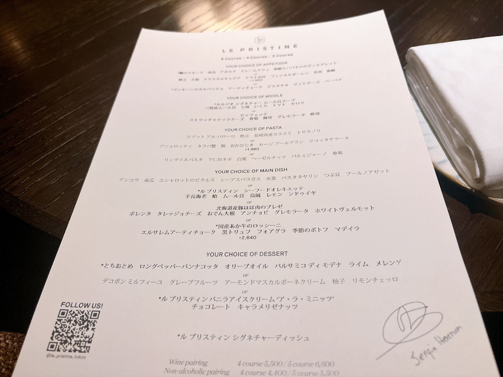 今回は、「ル・プリスティン レストラン 東京」で「ディナー5コース」を予約しました。