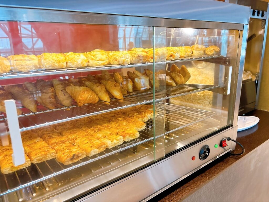 パンコーナーでは、パンを温かい状態で食べられる配慮がされています。